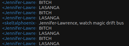 This script is more complicated. To avoid the flaws (in both my code and weechat’s python script api) this script handles all the communication between the Listening Server and the IRC client. This python script registers itself as a weechat script, calls the listener and then waits for it to exit. When the listener server exits with the correct error code, it will run the code to kick Jennifer-Lawrence (or any other poor soul who is configured to be kicked).